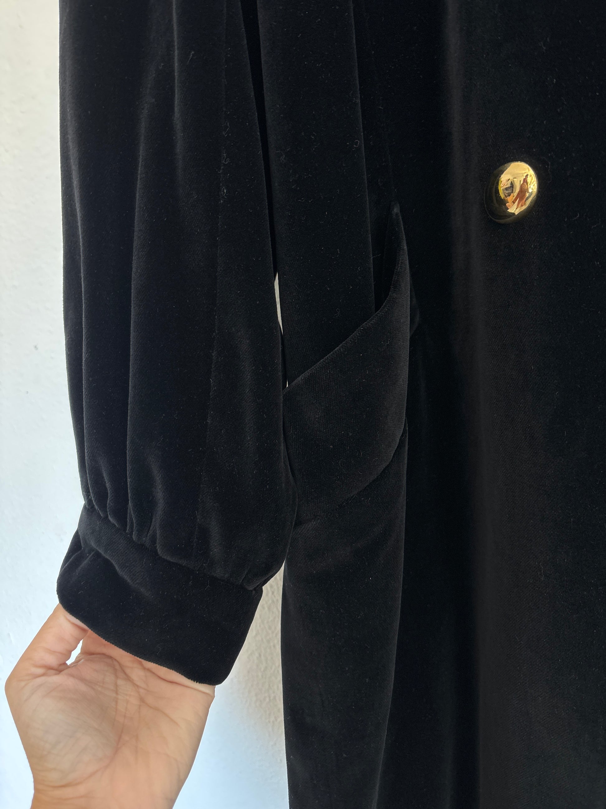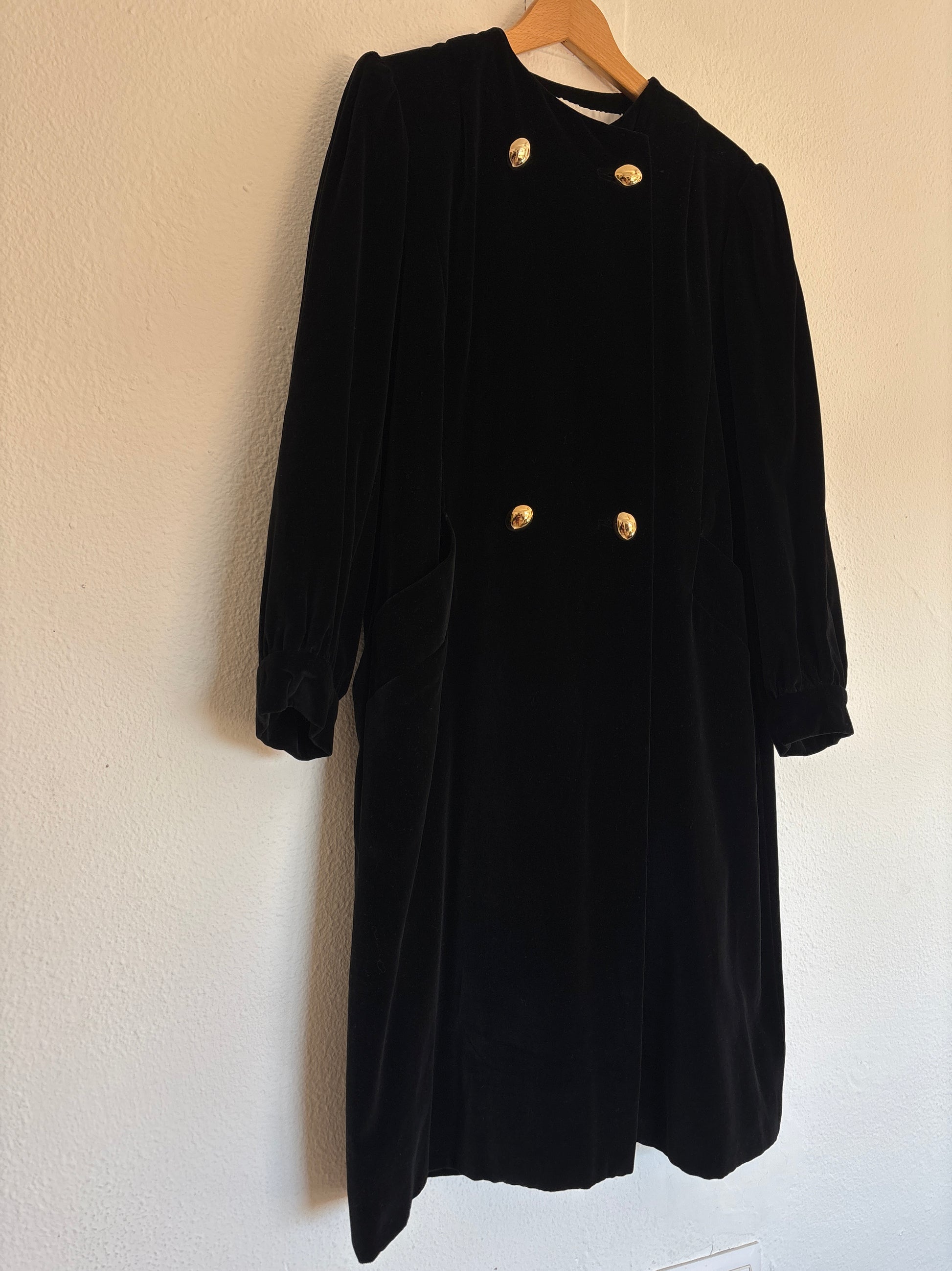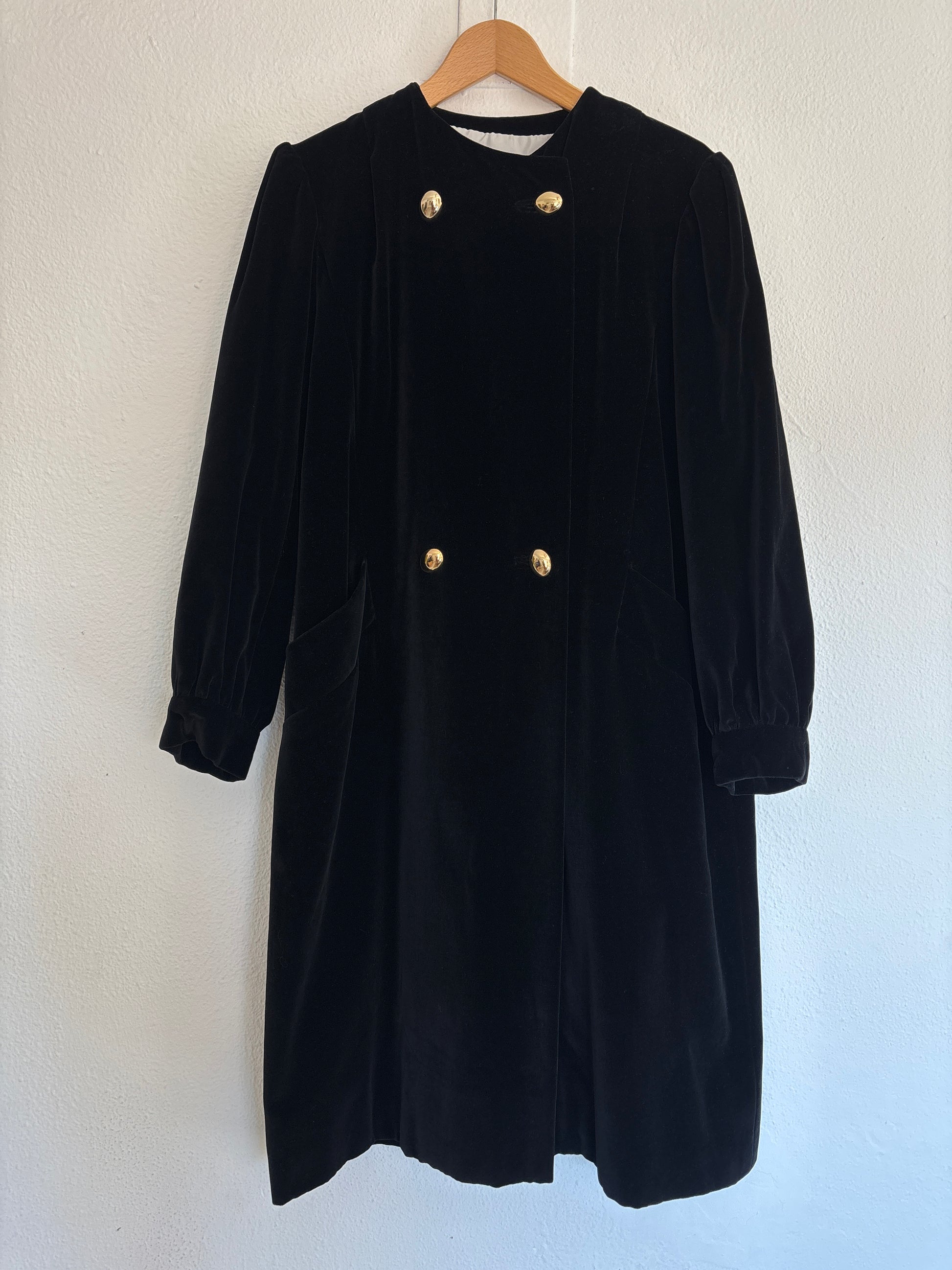 ·CARACTERISTICAS: maravilloso abrigo de terciopelo negro con botones dorados, original de los 60 de una casa Valenciana que se llama C.Bellido . Está forrado, no es elástico y tiene un corte precioso, que viste muy bien y es atemporal. Bolsillos laterales. No tiene marcas y está listo para estrenar. Una verdadera joya.