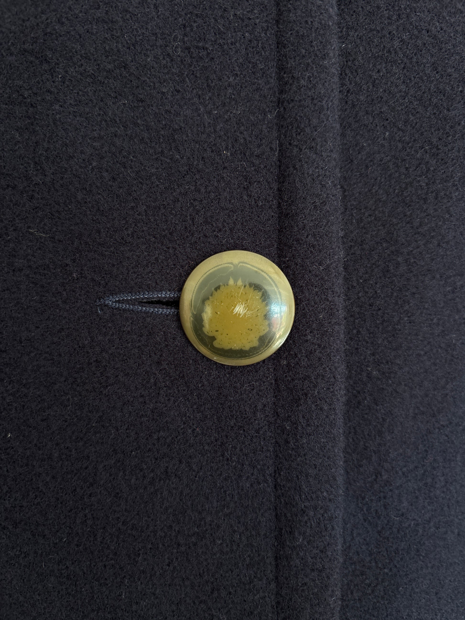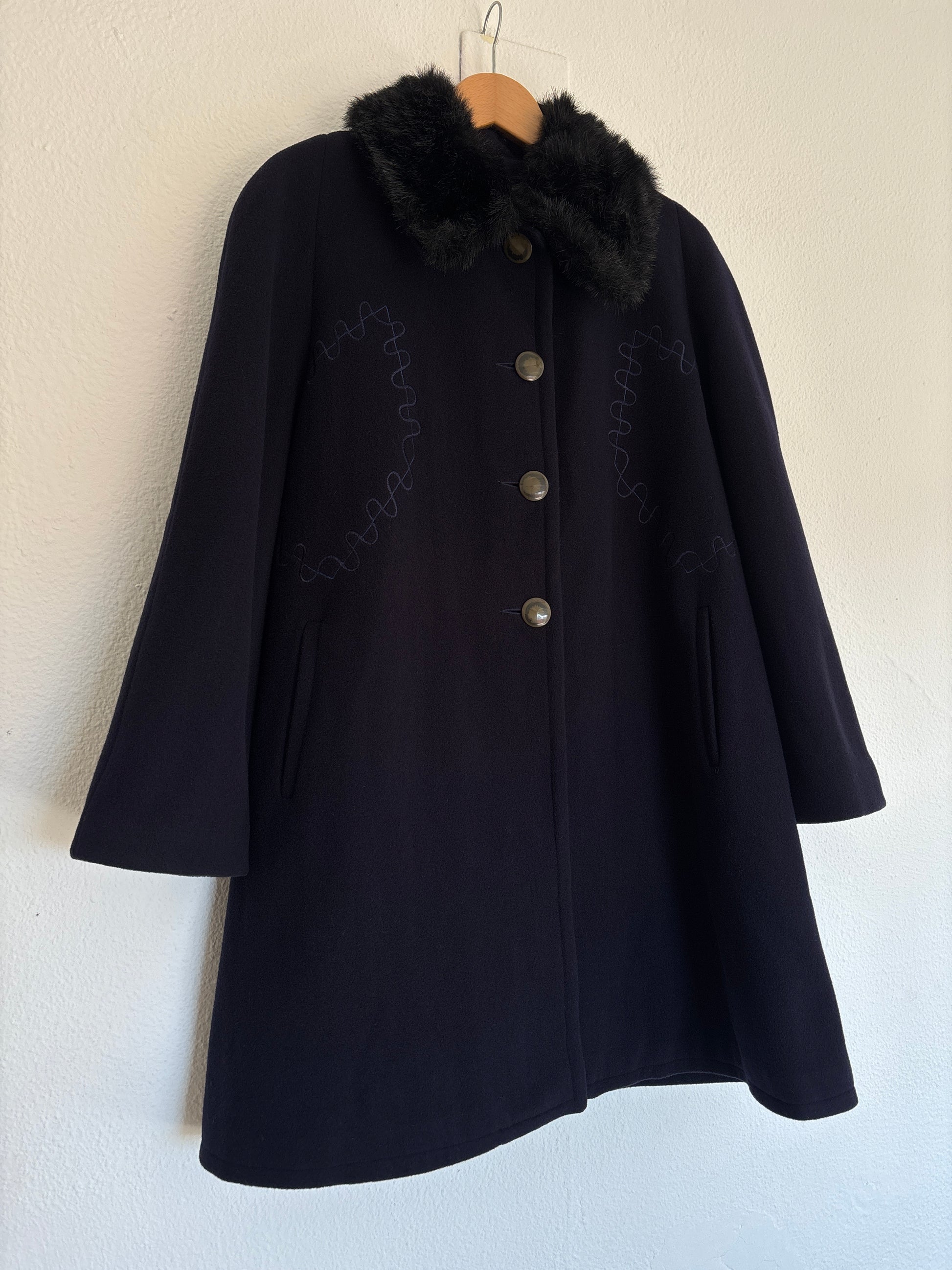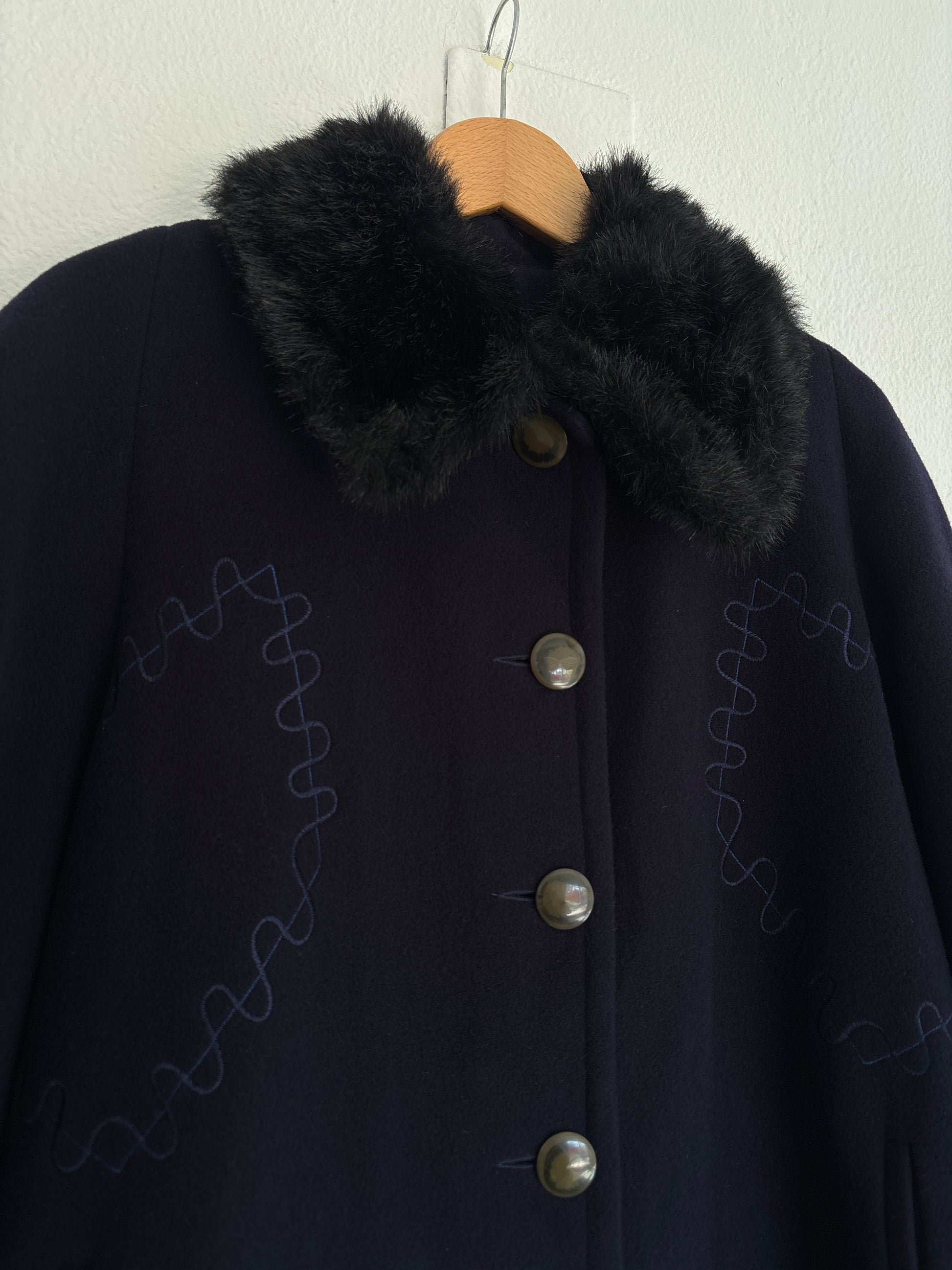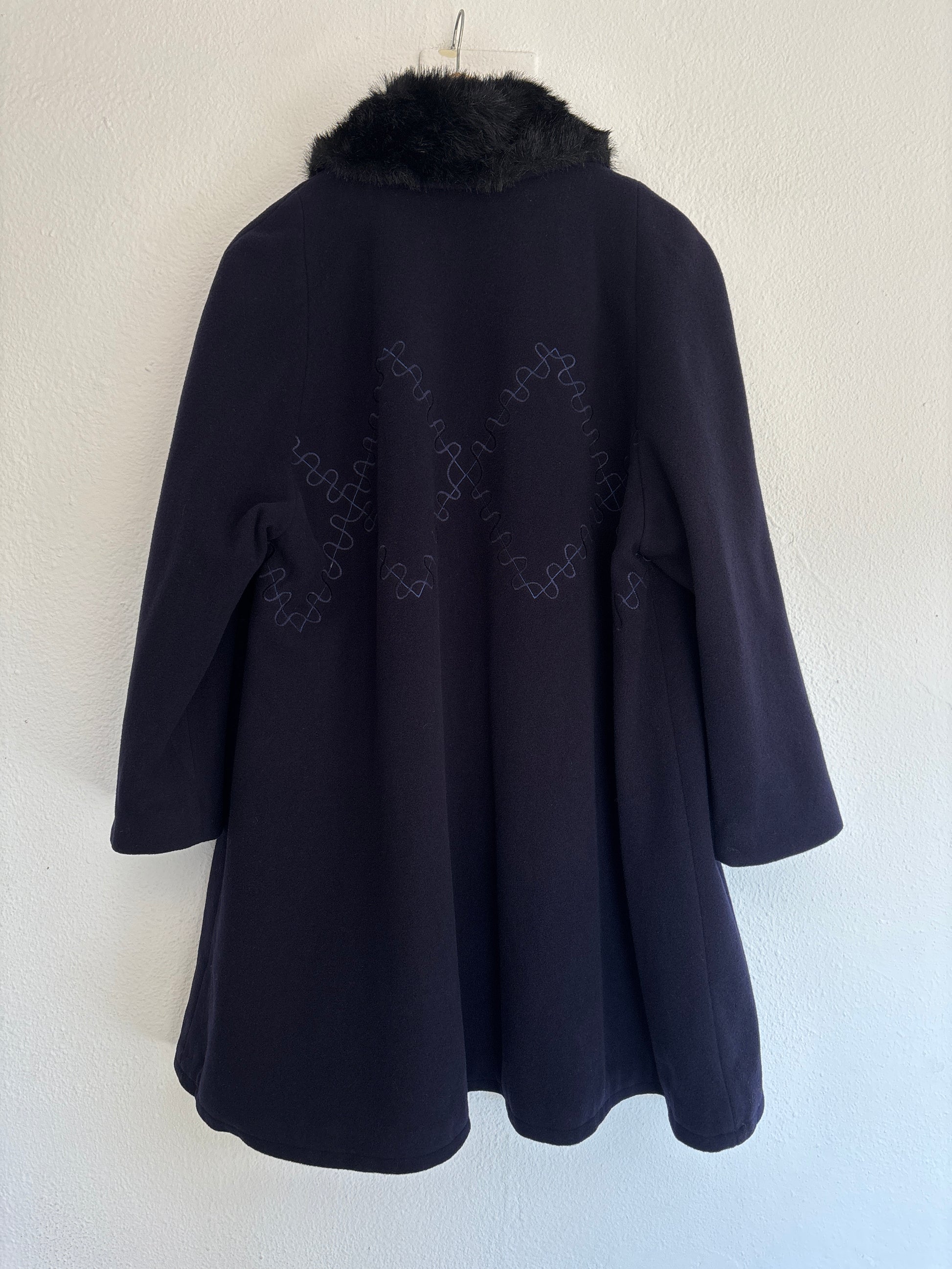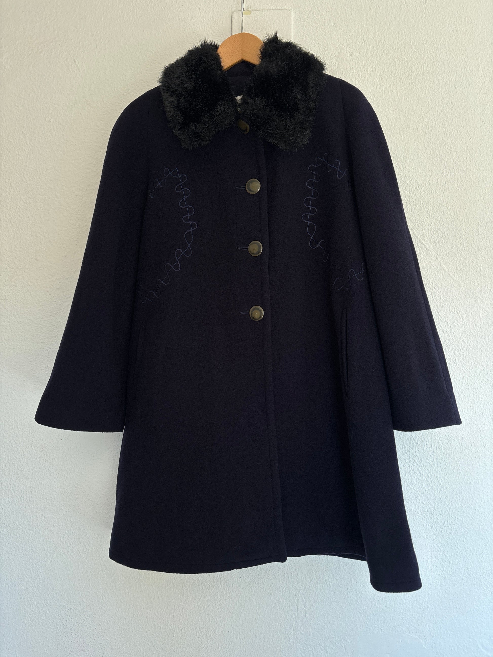 ·CARACTERISTICAS: Corte ancho bastante evasé, color azul marino oscuro y cuello nuevo de pelo sintético. Los botones son los originales. Tiene unos detalles bordados muy chulos, que le da un toque muy especial. Está forrado. Un clásico que va con todo. Calentito y elegante.