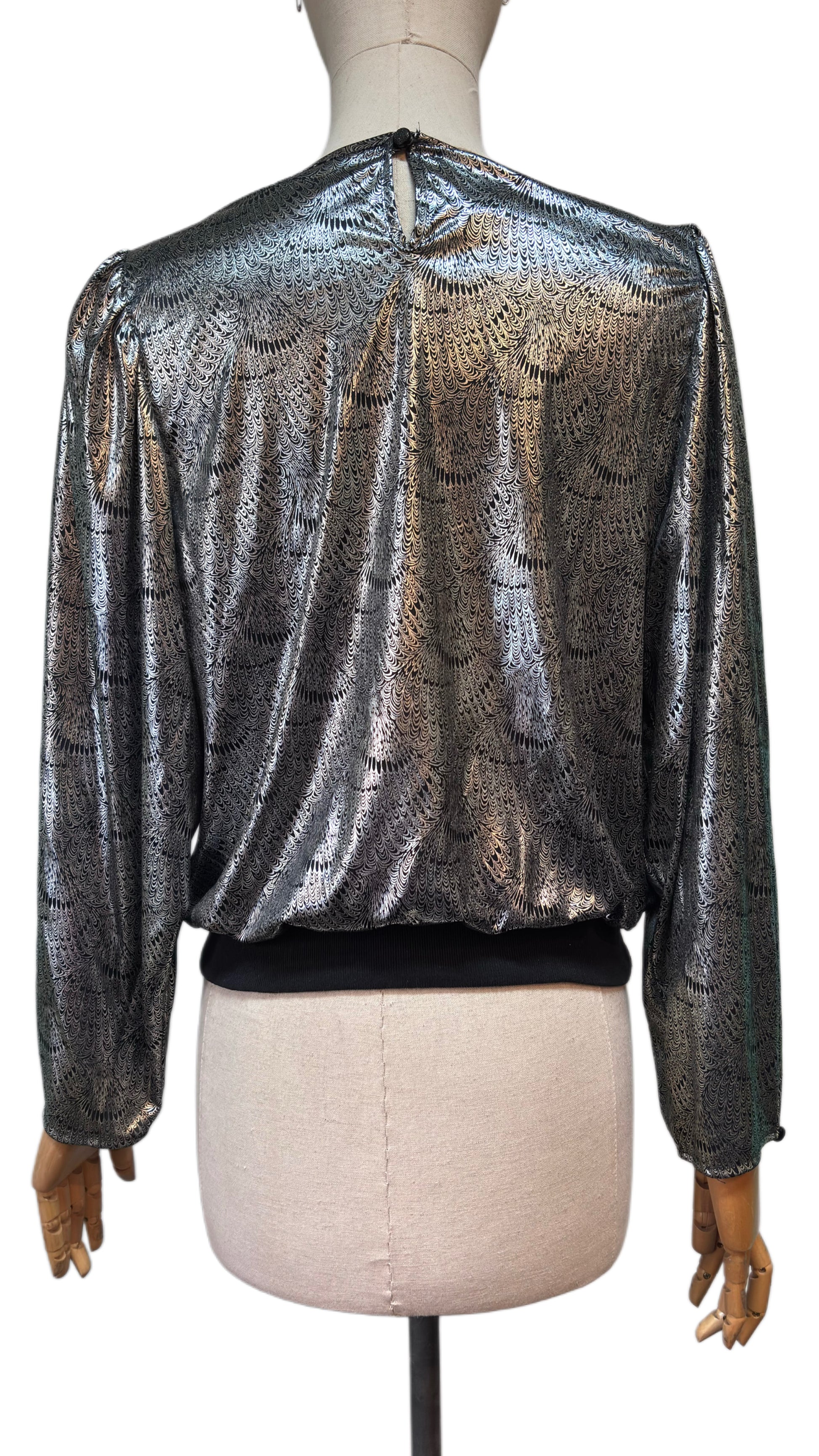 ·CARACTERISTICAS: preciosa blusa plateada, con estampado en negro pequeñito, muy original. Es muy suave y queda perfecta al cuerpo. Elástica, tejido fino. Mangas anchitas. Un clásico de la época que se adapta perfectamente a la actualidad.