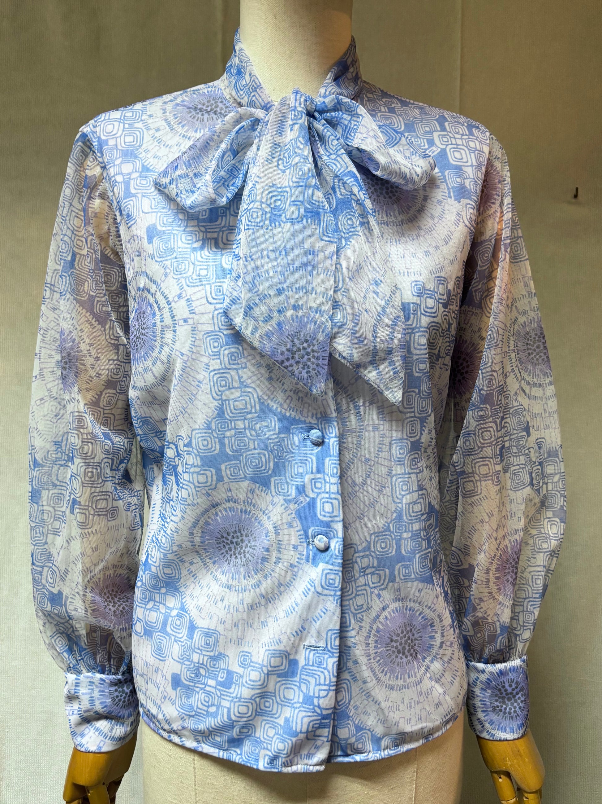 •CARACTERÍSTICAS: Estampado precioso, color azul, mangas transparentes y cuello con lazo. Inglesa, de St. Michael. Es una pasada de bonita! No es elástica.