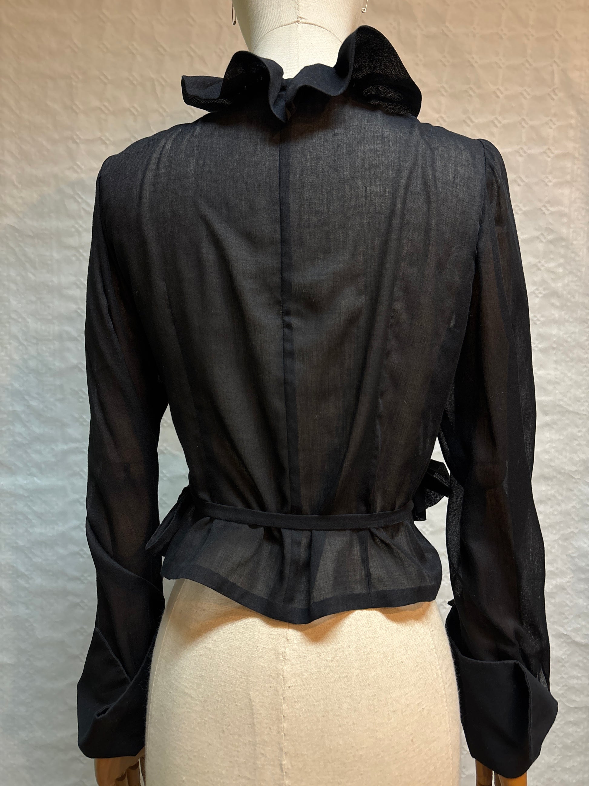 ·CARACTERISTICAS: totalmente hecha a mano, con el cuello de volantes, corte ajustado. Mangas anchitas, cintura ajustable. El tejido es muy suave, no tiene brillo y es transparente. Una pieza fantástica y muy original.
