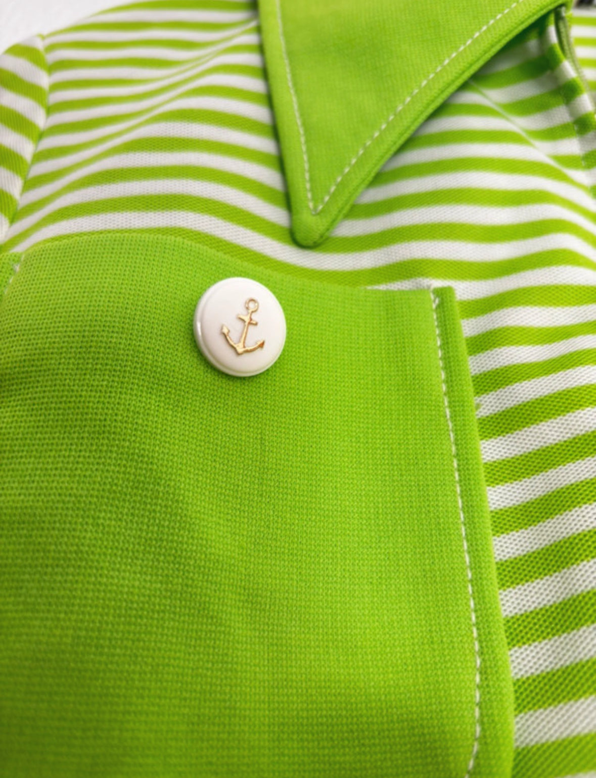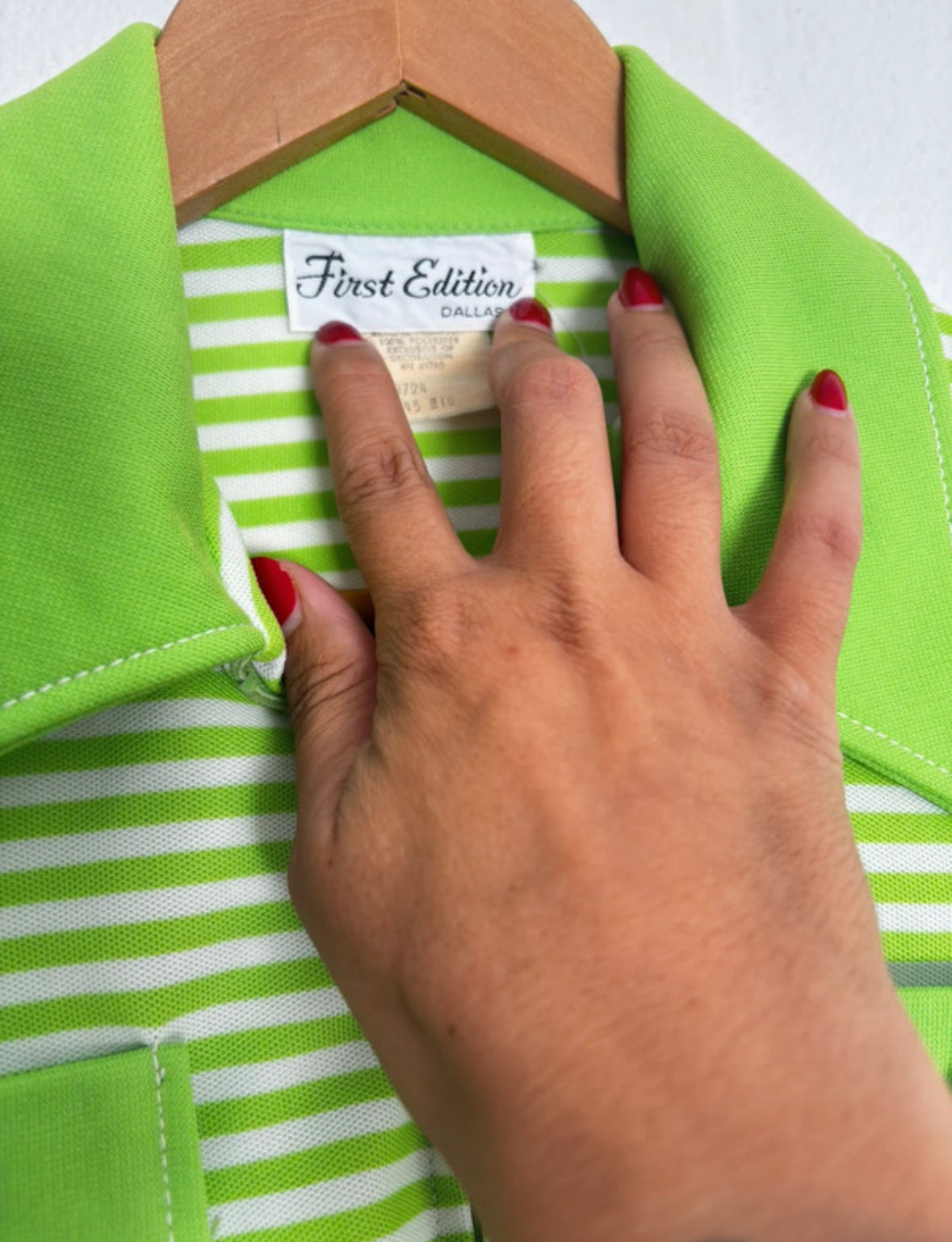 •CARACTERÍSTICAS: verde y blanca de rayas, cremallera frontal. Corte típico de la época, perfecta para entretiempo. Tiene algunas pequeñas marquitas del paso del tiempo pero nada que sea visible. Botones blancos marineros, con bolsillos.
