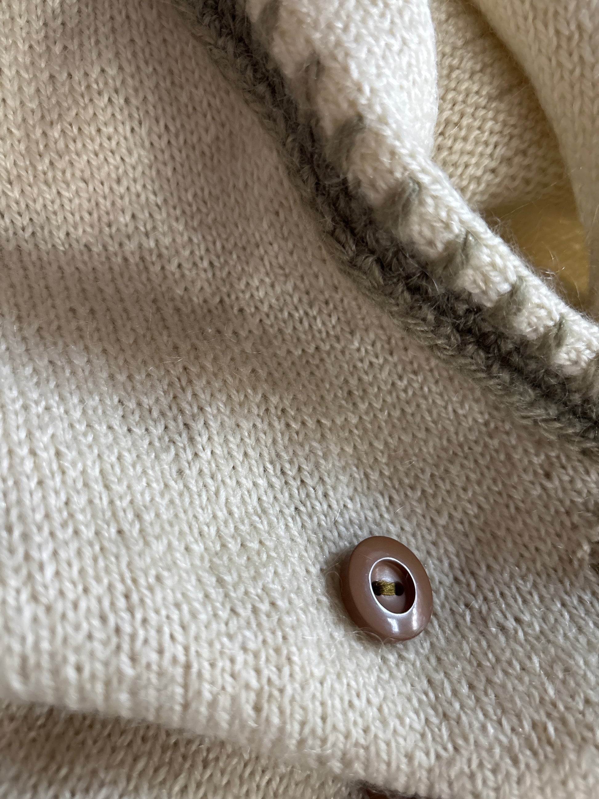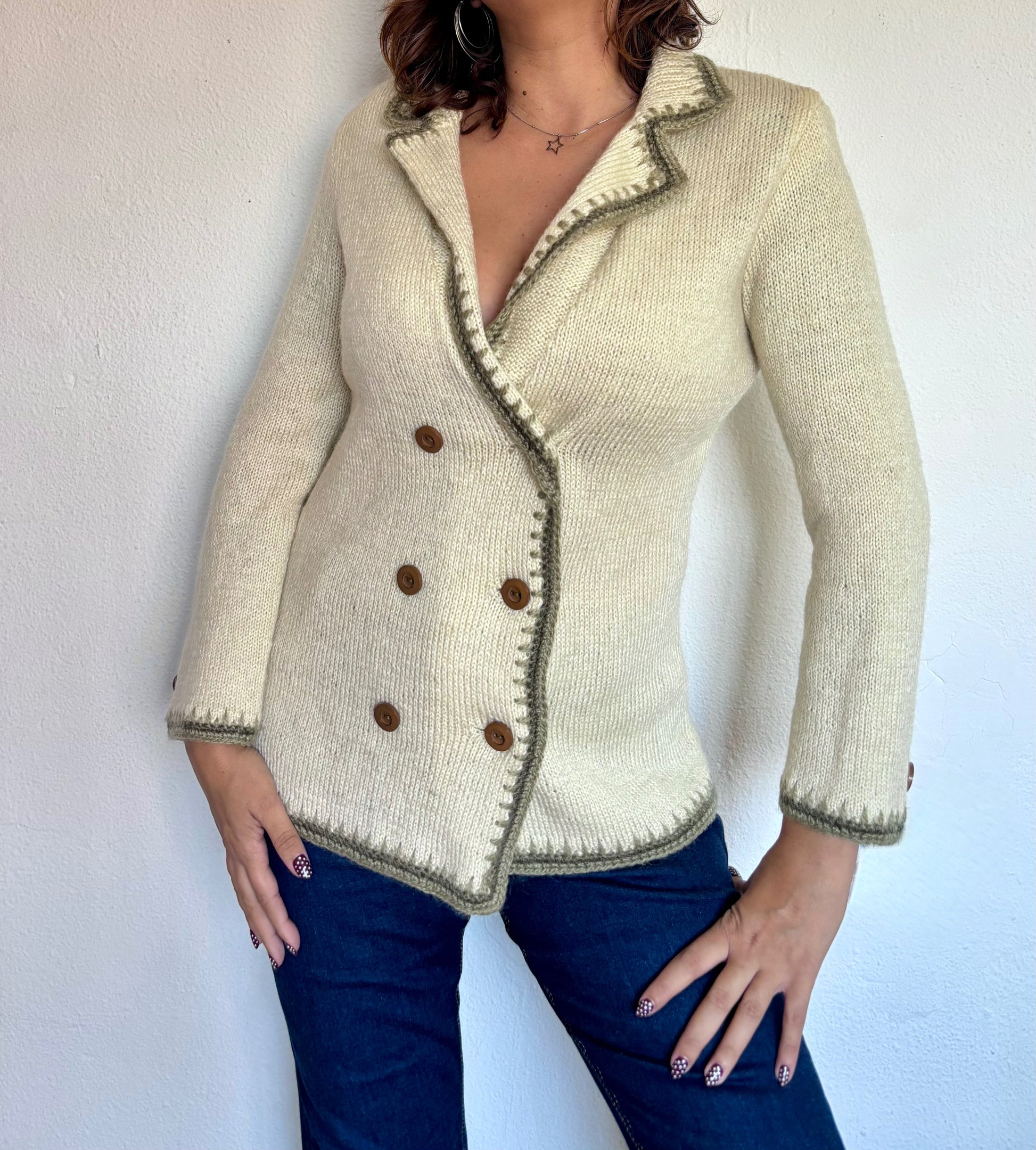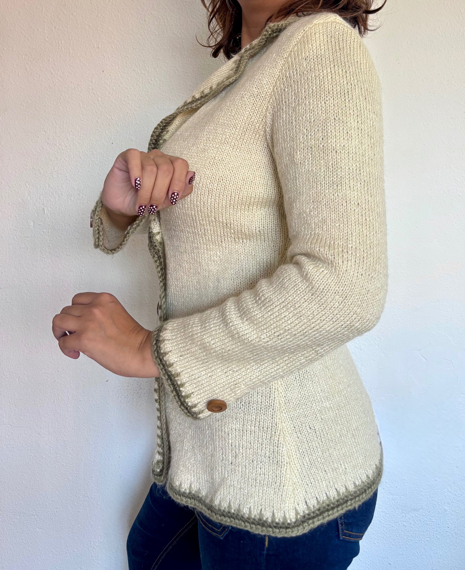 ·CARACTERISTICAS: precioso cárdigan hecho a mano de lana, original de la época. Color beige y verde oliva. Viste como una chaqueta y queda muy bonito. Fácil de combinar, de calidad y atemporal.