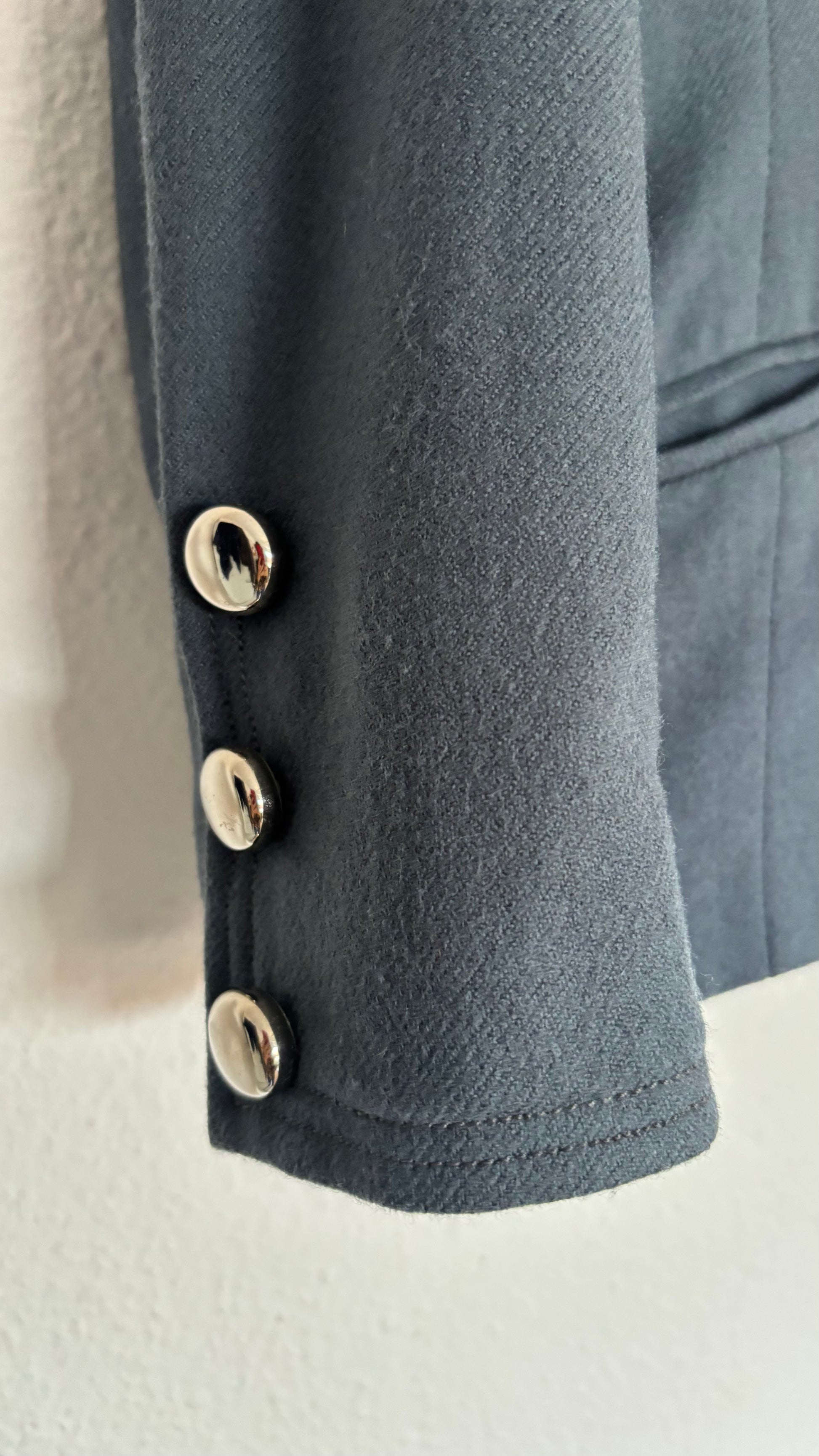 ·CARACTERISTICAS: preciosa chaqueta de color azul grisáceo, con botones grandes metálicos. Está forrada y es calentita. Viste ajustada y es un básico muy fácil de combinar, pero que da este toque diferente al look. Hecha a mano. Está de tintorería y perfecta.