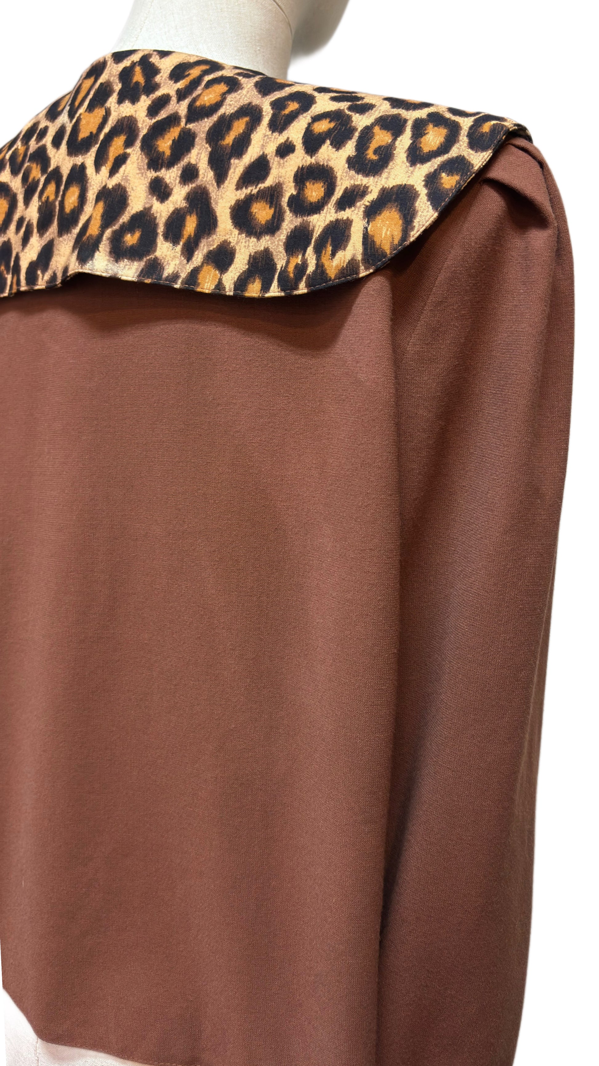 ·CARACTERISTICAS: preciosa chaqueta marrón chocolate con cuello y puños de leopardo. Es finita, muy suave la tela y no es elástica. Tiene las hombreras originales pero se pueden quitar. No está forrada y no se cierra, es para llevar abierta. Botones plateados originales. Mangas abullonadas. Tiene una marca en la espalda (ver última foto), pero que se nota muy poco en directo. No creo que le quite prestigio ni belleza, así que merece totalmente una segunda vida, Por eso el precio reducido.