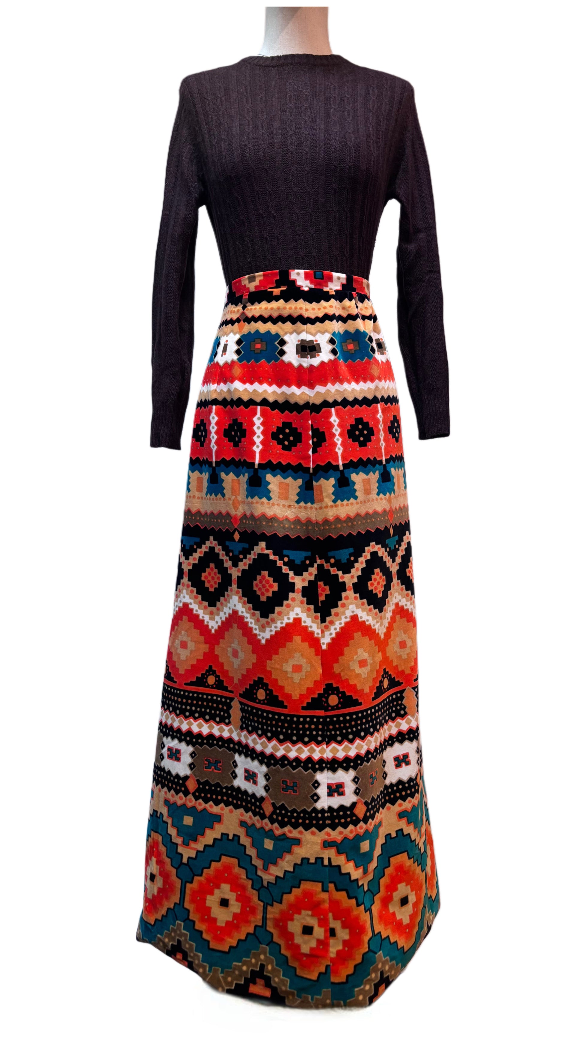 ·CARACTERISTICAS: maravilla de falda original de la época, calentita y perfecta para el frío. Colorida, con un estampado precioso, forrada y de cintura alta. Línea evasé, muy favorecedora. Una joya!