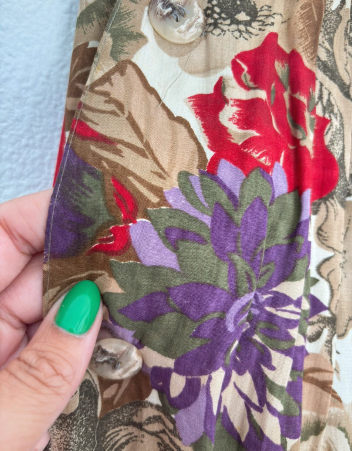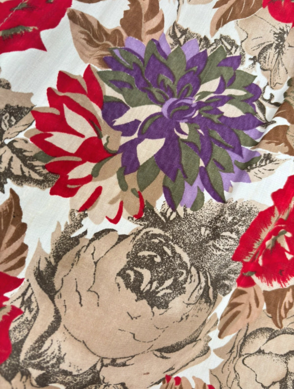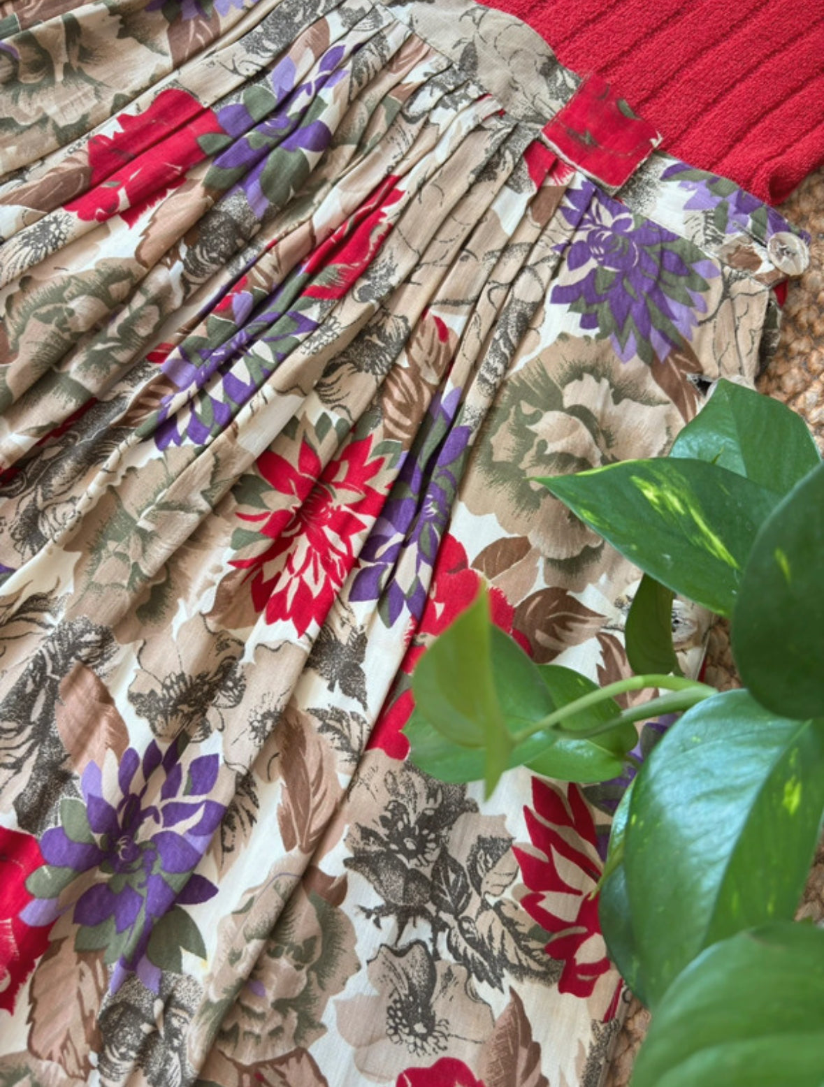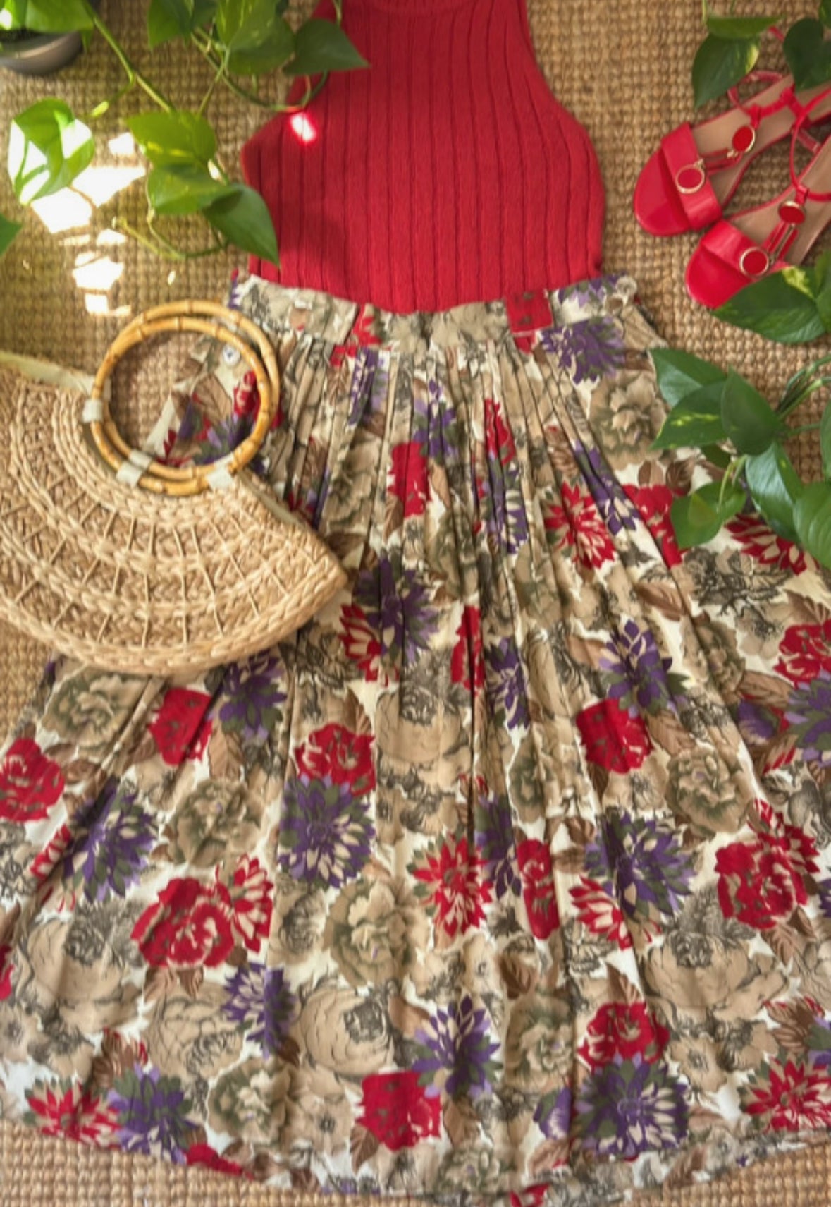 •CARACTERÍSTICAS: Falda midi original de los años 80. De color marrón, con flores rojas y moradas, estampado colorido y muy veraniego, con bolsillos. Es alemana. Forrada. Fresquita e ideal!