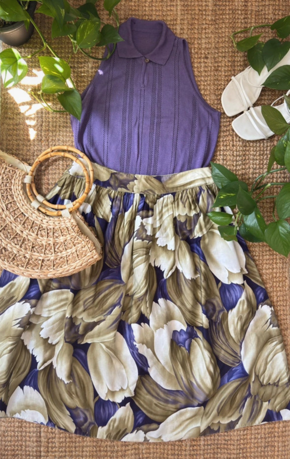 •CARACTERÍSTICAS: De algodón 100%, beige y morada, con estampado chulísimo. Fresca y atemporal. No tiene forro. Hecha a mano. Va con todo y es una pieza muy especial.