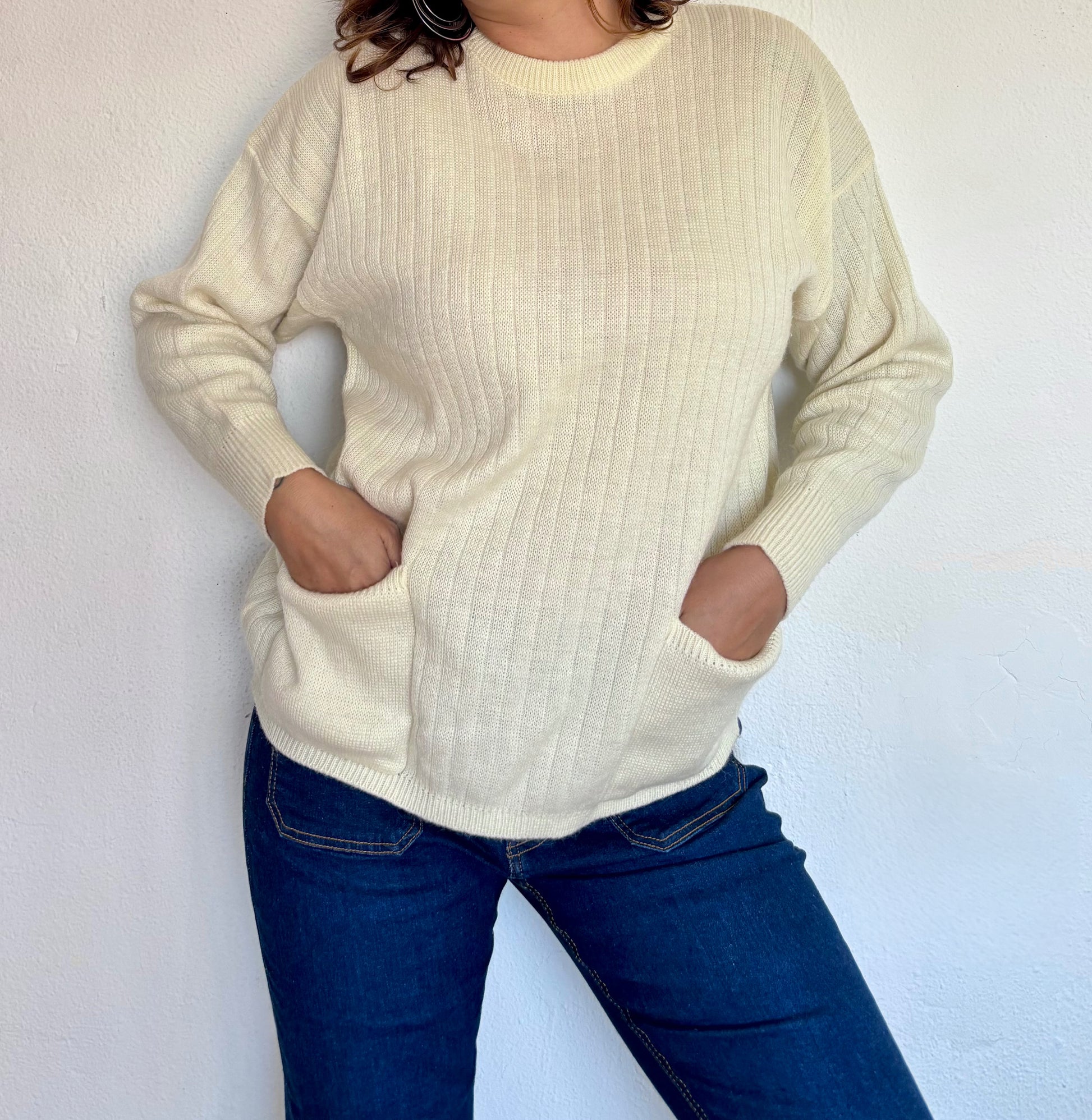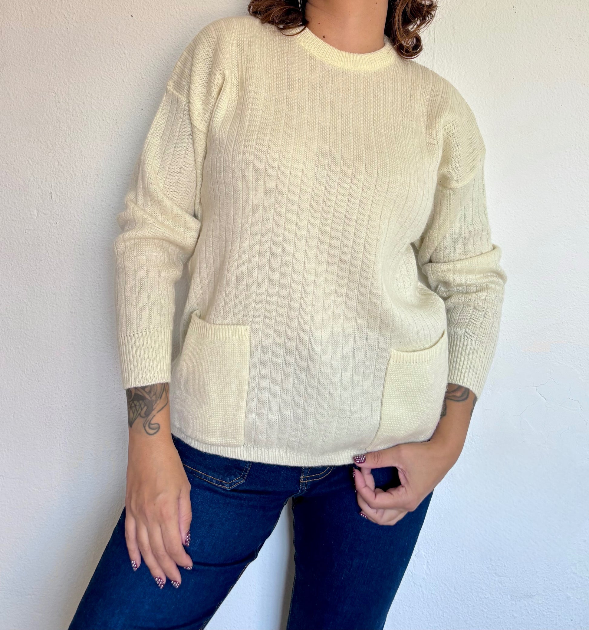 ·CARACTERISTICAS: muy calentito, color beige clarito, con bolsillos frontales. Estilo oversize, un clásico que va con todo.