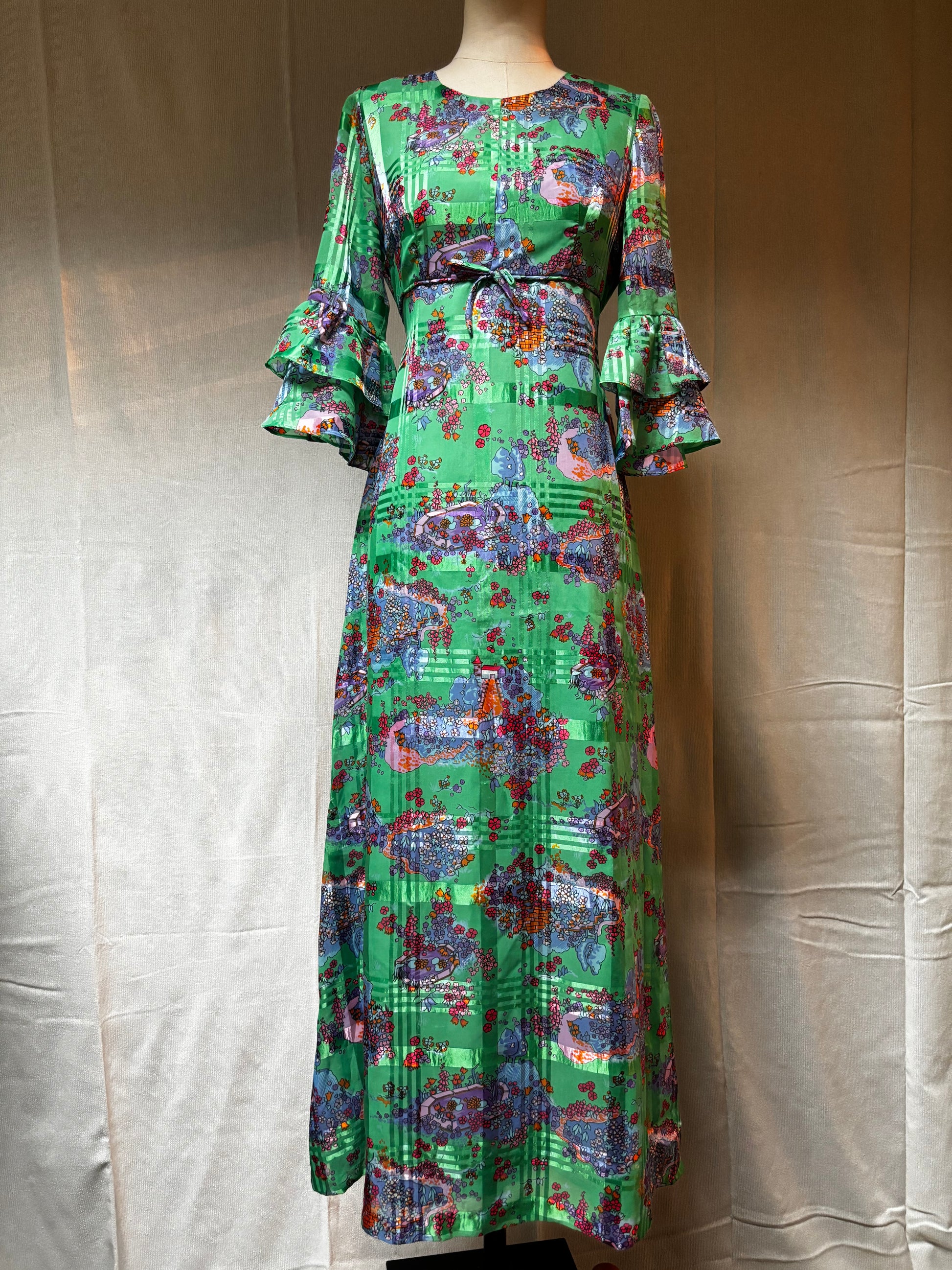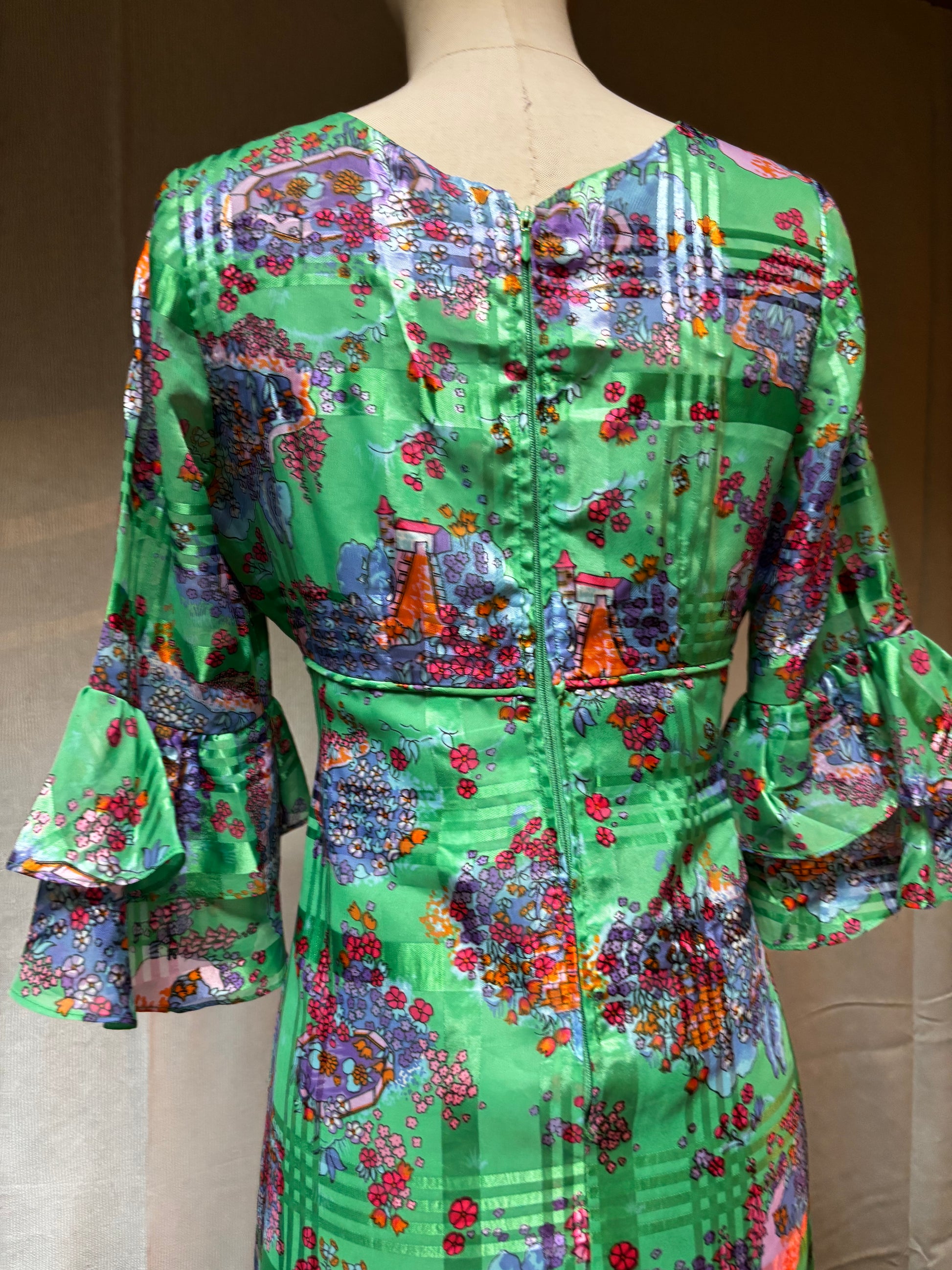 •CARACTERÍSTICAS: vestido precioso con tejido de raso brillante, estampado novelty print. Mangas acampanadas, forrado, cremallera trasera. No es elástico. Una pieza única y muy especial.