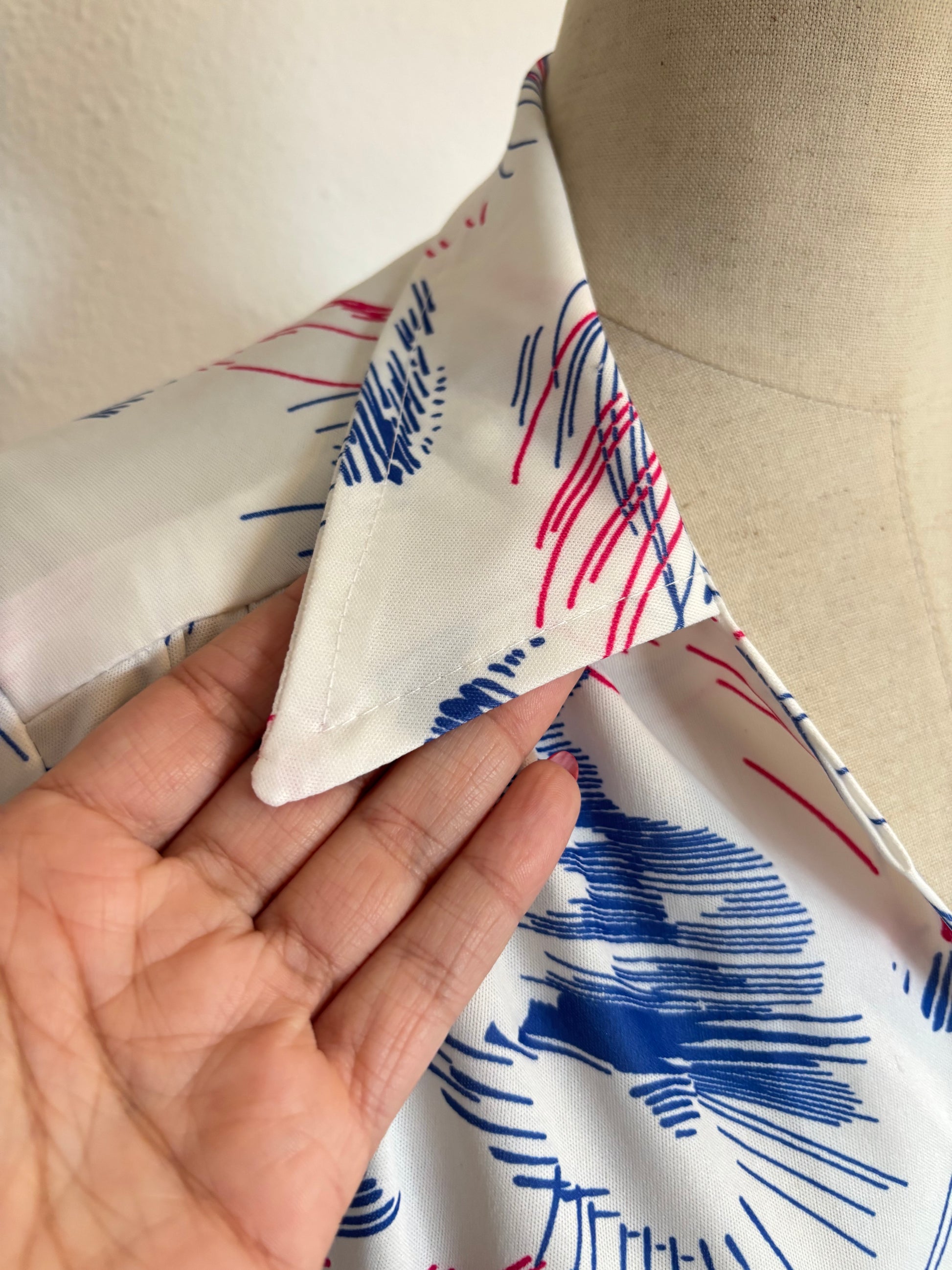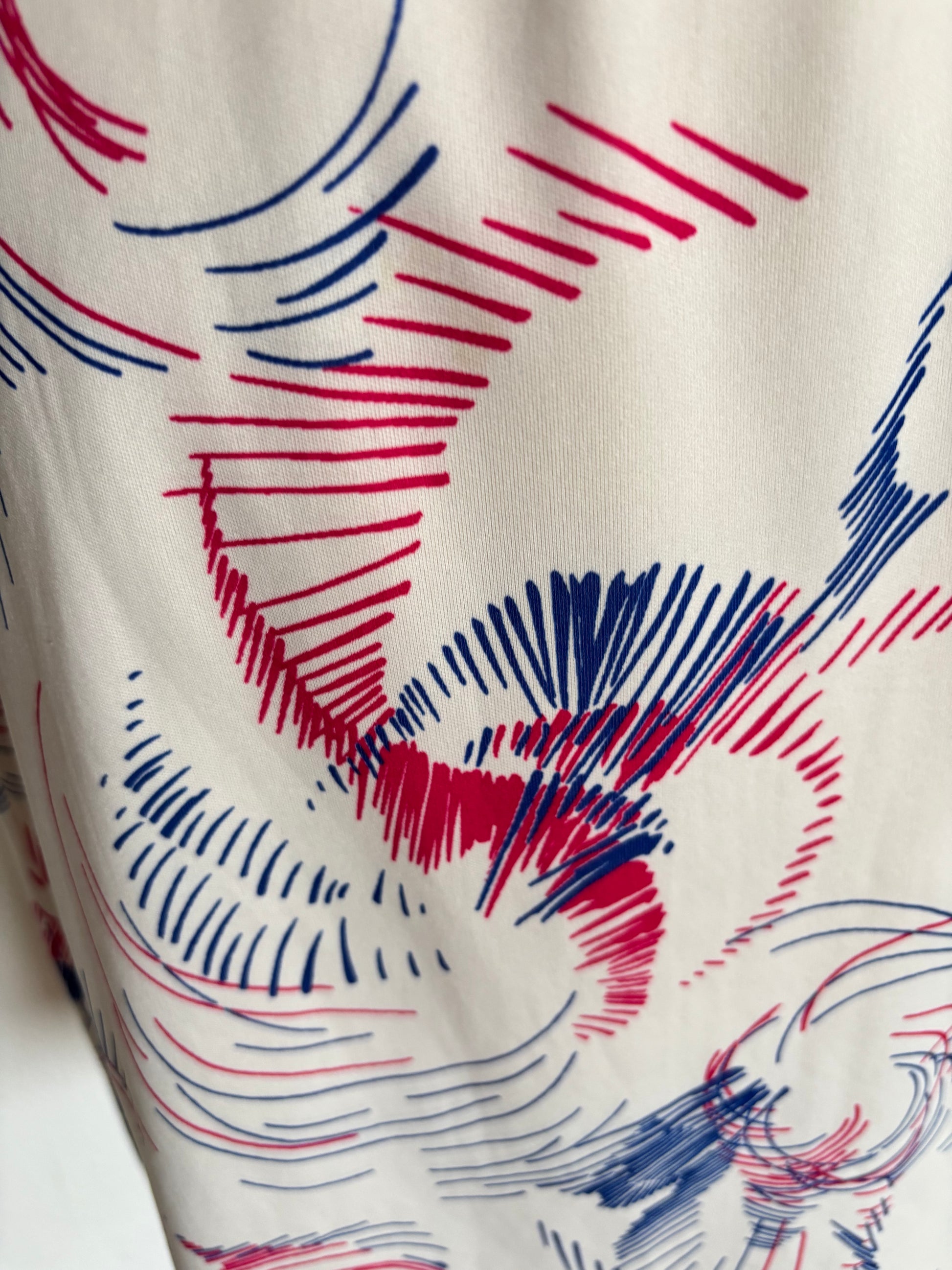 •CARACTERÍSTICAS: Color blanco, azul y fucsia, con estampado muy original. Es elástico, corte evasé, perfecto para llevarlo con cinturón o así suelto. Fresco, tiene mucha caída.