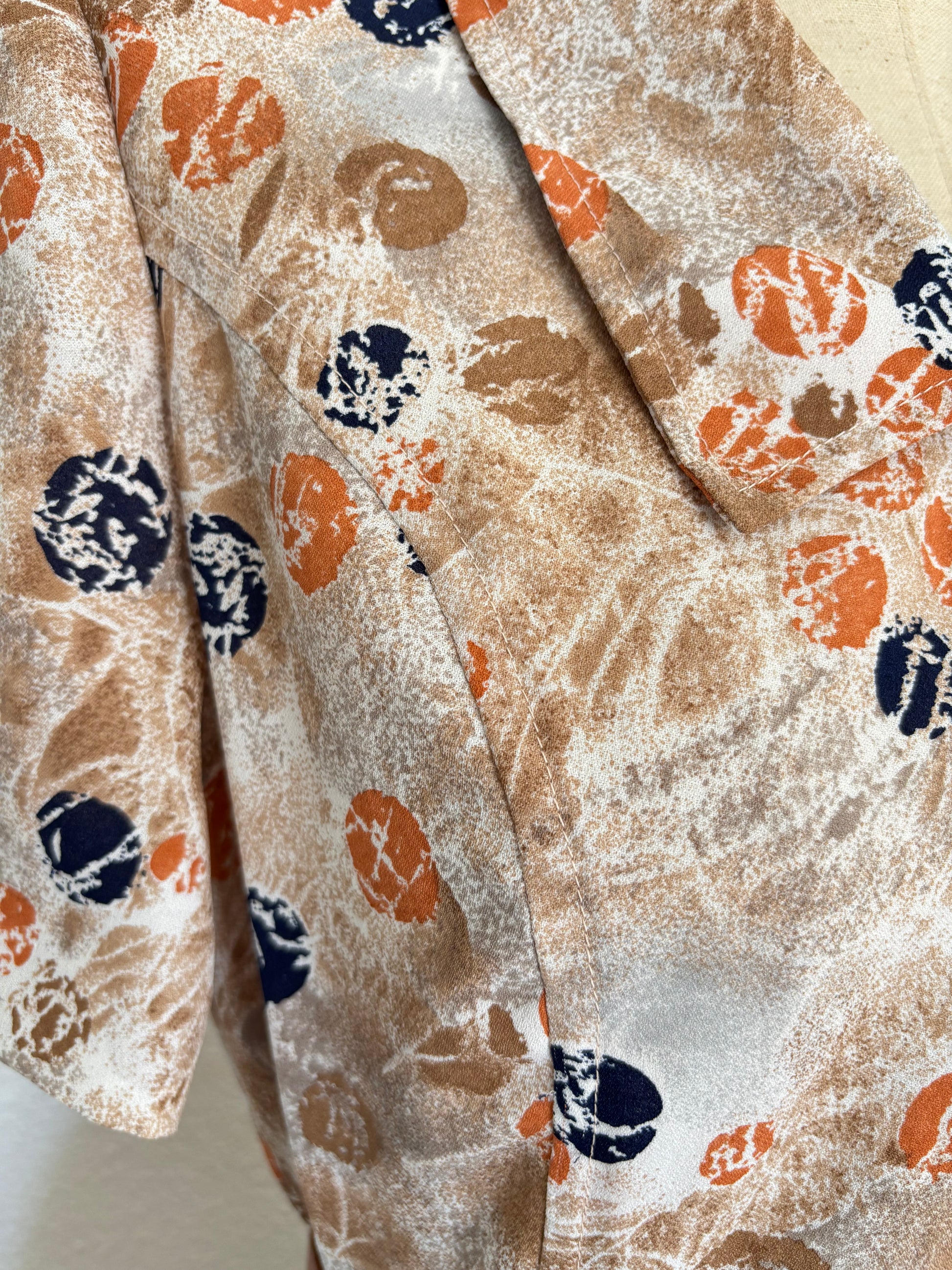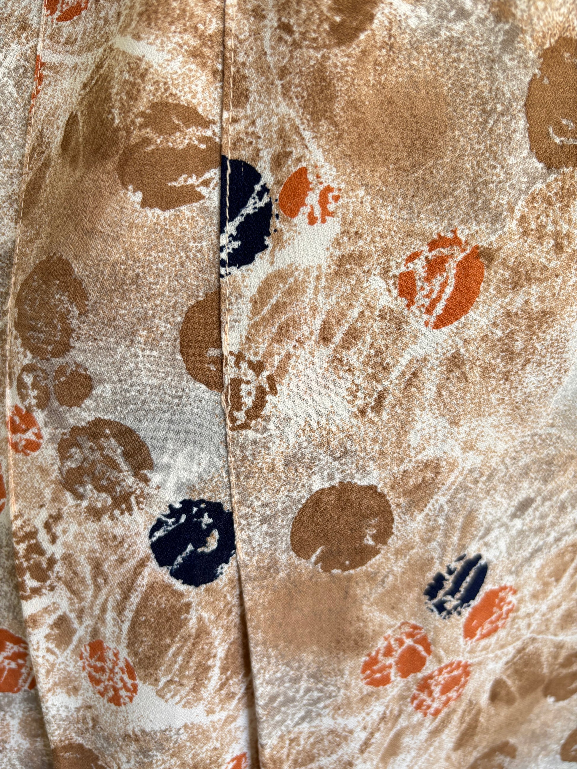 ·CARACTERISTICAS: Corte camisero, color beige, naranja y marrón. Es un clásico que queda bien con todo. Está en excelente estado, hecho de modista. Fresco, de falda evasé. No tiene forro. El cinturón no está incluido.
