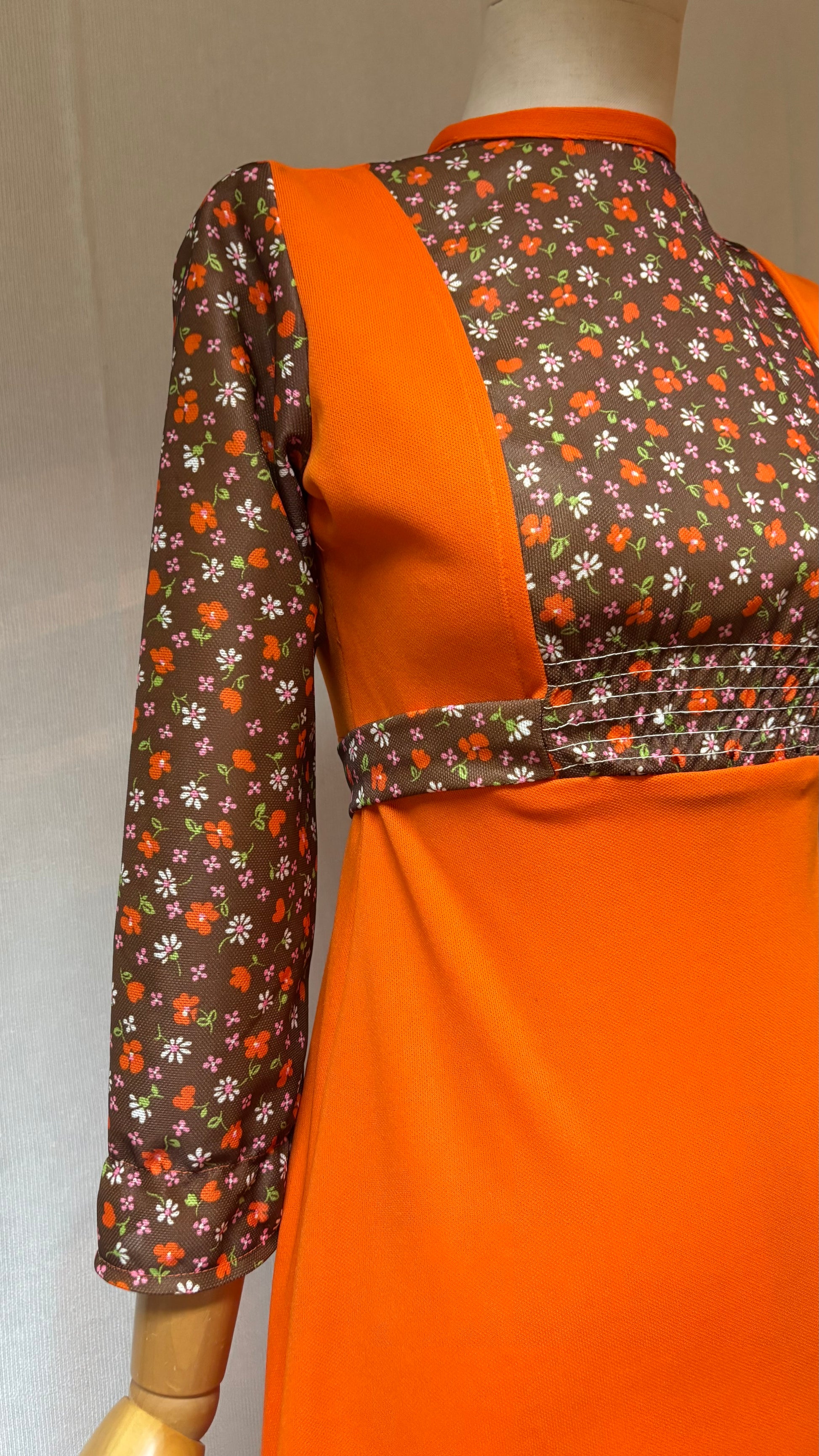 •CARACTERÍSTICAS: precioso color naranja con estampado de florecitas pequeñas y cintura ajustable. Prairie dress divino para el otoño, muy especial y original. Es pequeñito y da poca talla de pecho y espalda. Es elástico y no está forrado.