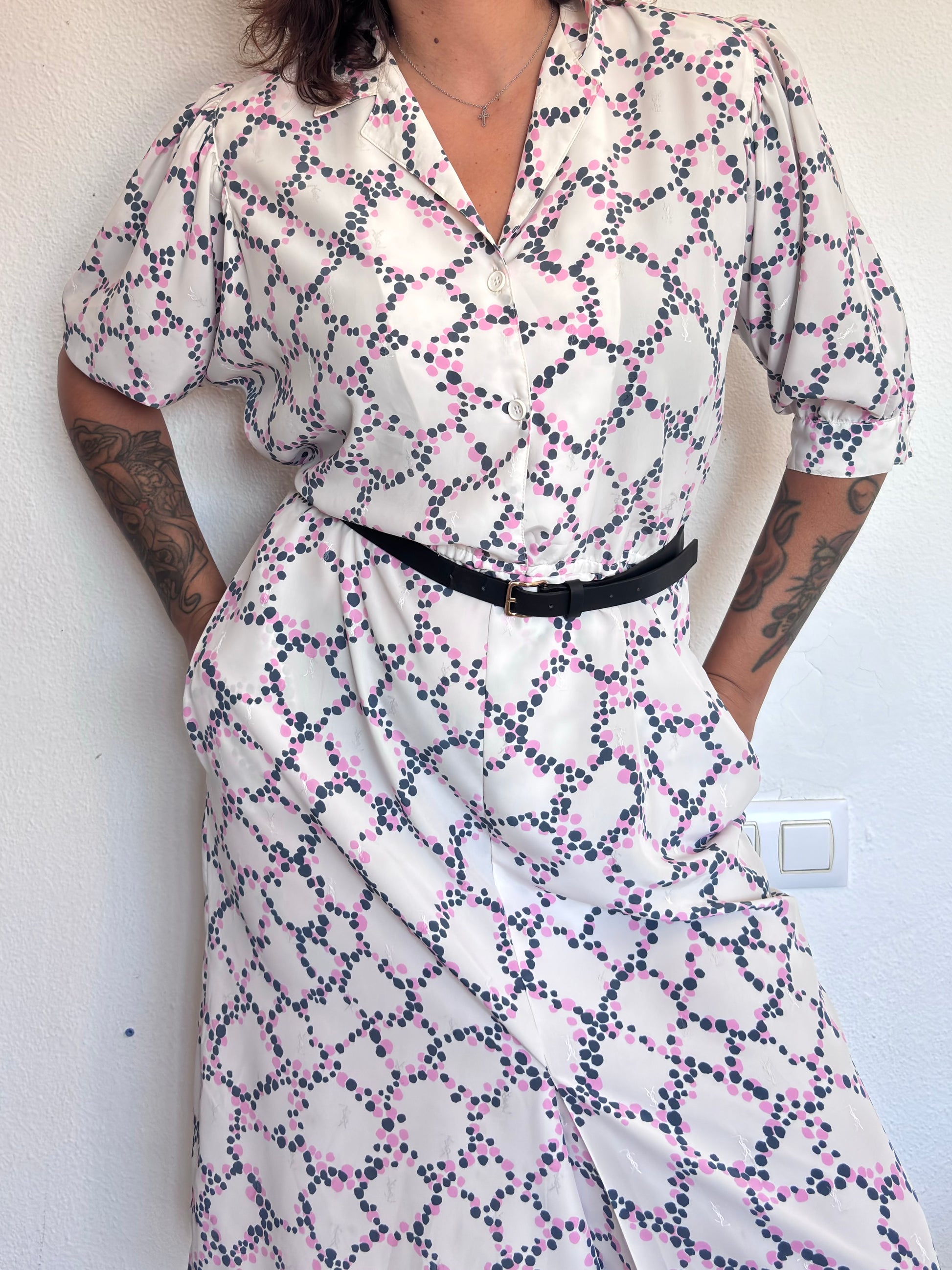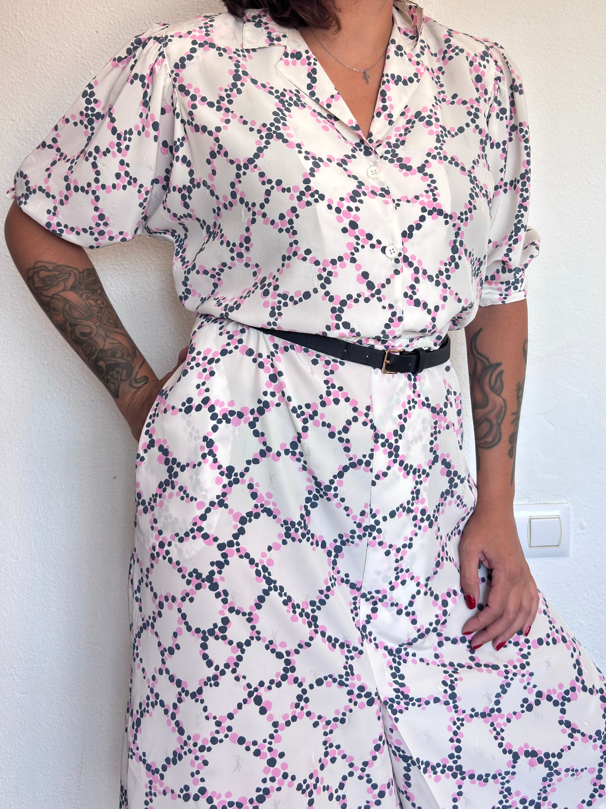 ·CARACTERISTICAS: blanco con estampado de lunares. Bolsillos laterales. Tiene mucha caída y queda genial. Tiene el logo marcado por el tejido, que es delicado, muy suave y no es elástico.